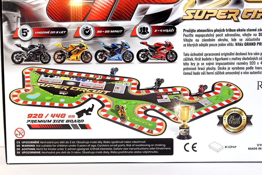Tato úchvatně zpracovaná originální desková hra vám přináší nezapomenutelný herní zážitek. Hrát budete s figurkami s motivy skutečných závodních motorek. Hrací deska této hry je se svými impozantními rozměry 920 x 440 mm zařazena mezi naše prémiové hrací plochy. Deska je vyrobena podle tvaru samotné závodní trati, díky čemuž bude váš herní zážitek umocněný a více autentický.